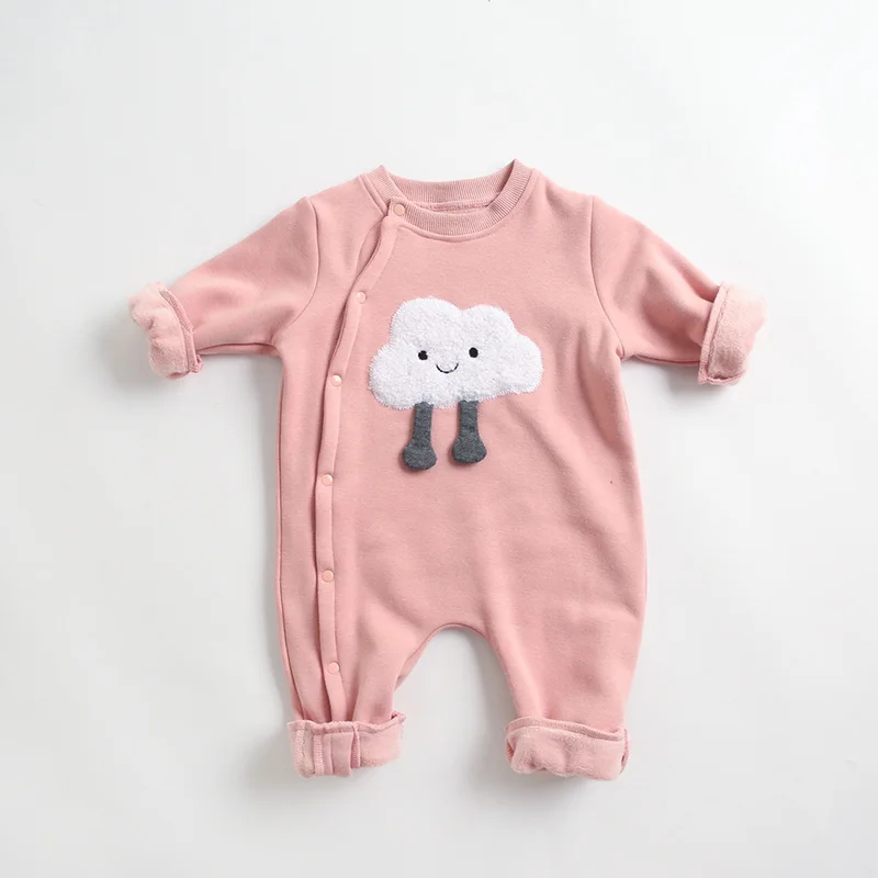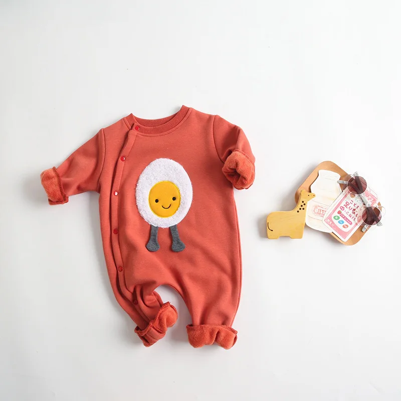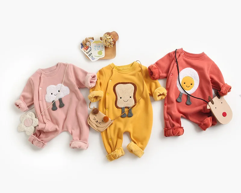 This adorable baby jumpsuit with a fun cartoon design is made of soft cotton that will make your little one feel like a star on any occasion. This versatile jumpsuit is perfect for everyday wear. The fun design of this romper makes it an adorable addition to any wardrobe. The design comes in toast, eggs, and clouds.