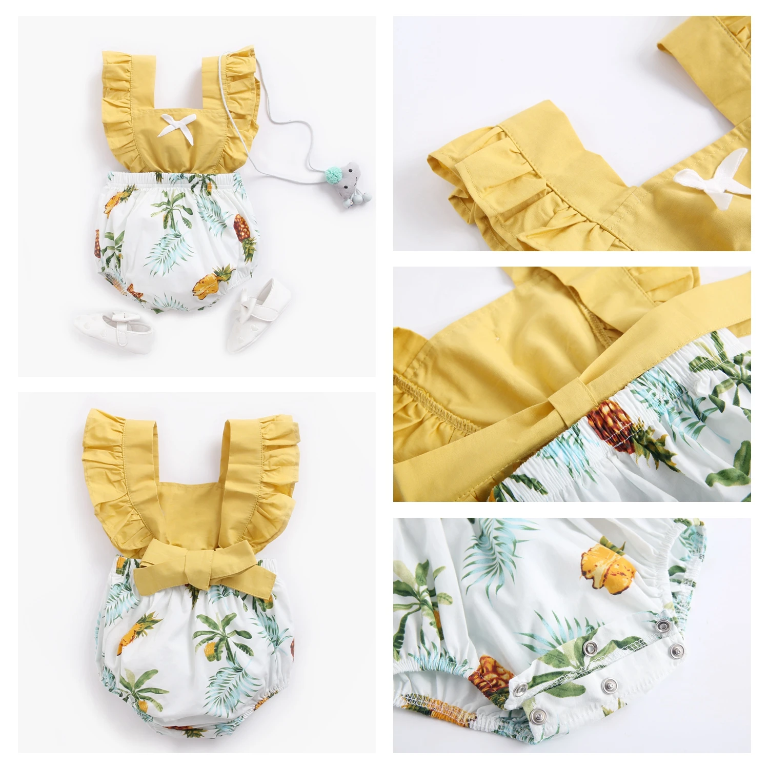 Dress your little one in this baby-printed romper for a summer-ready look.  Featuring soft frills and shoulder straps that tie into a beautiful bow at the back. This one-piece sleeveless and backless one-piece is perfect for warmer weather. The Baby Printed Rompers is a fashionable and functional wardrobe essential. Made with super lightweight cotton, they'll be comfy enough to play all day.