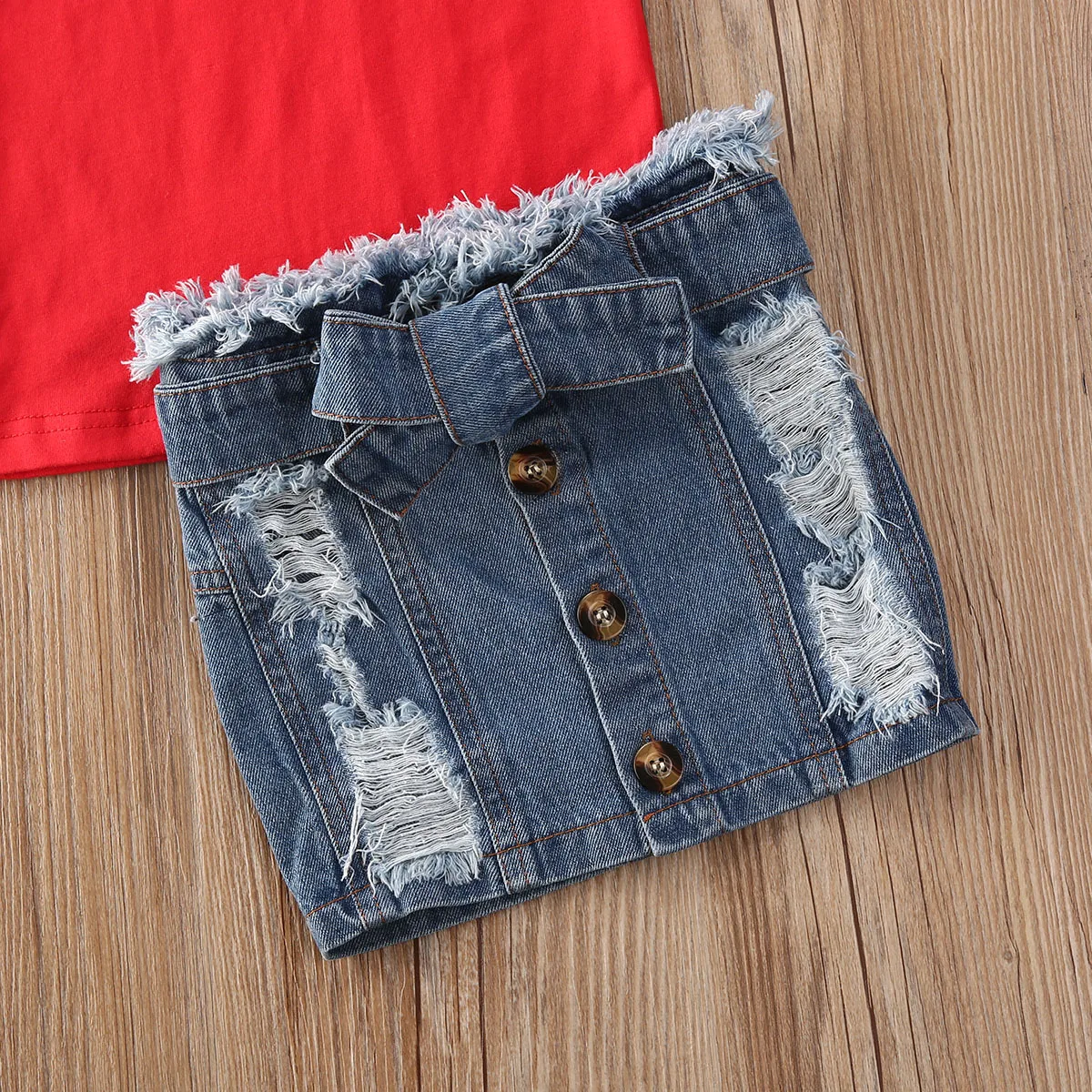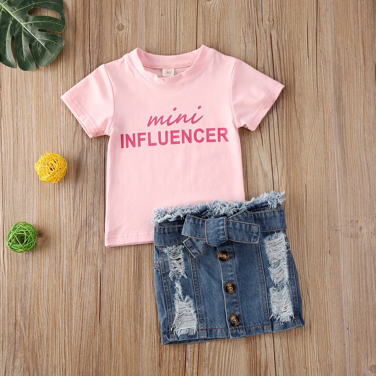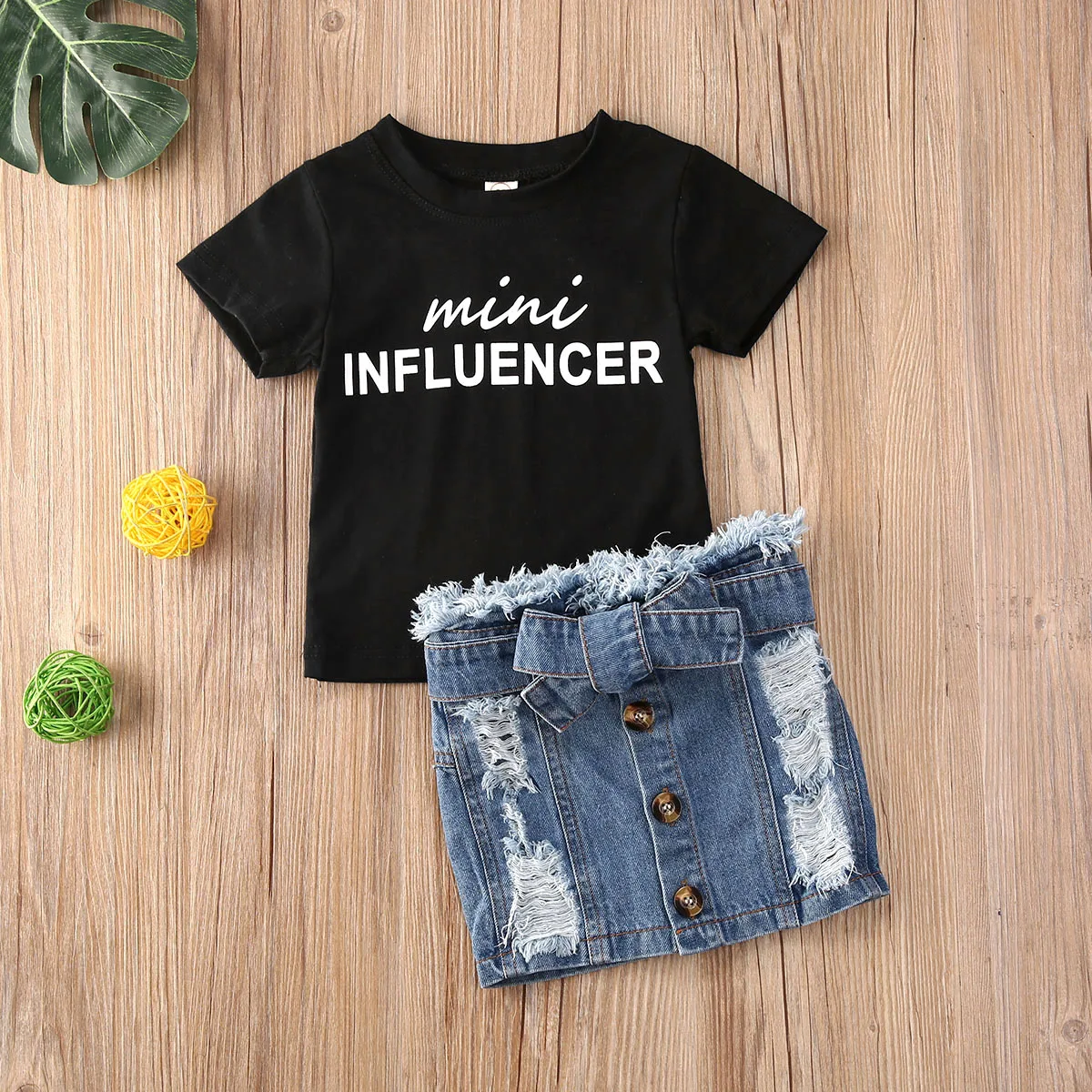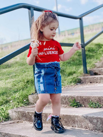 These short sleeve tee with a mini influencer statement comes with a set of denim short skirts. The denim mini skirt features a front button and a self-tie front. Why not wear this mini influencer denim dress outfit with pride and give your little one a pat on the back for being awesome.