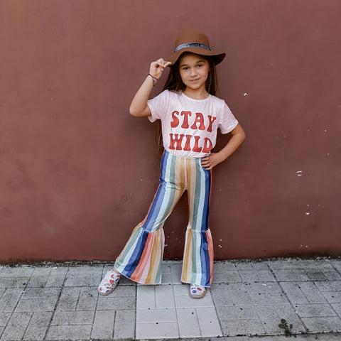 Bring it back the retro vibes. Let your kids wear this stylish outfit that features a statement shirt and colorful vertical stripes with flare style at the bottom. It has retro-inspired because of its pants style. It is made of cotton and lightweight material. Perfect for any party or even casual occasion. Let your kids feel the retro-modern vibes on the groove. Add a chic ankle bootie and a wool coat for a winter-approved ensemble.