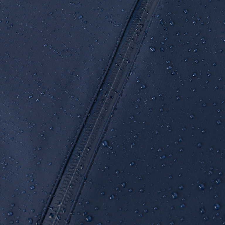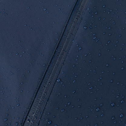 Full-length, waterproof zipper with a wind flap and a zipper garage