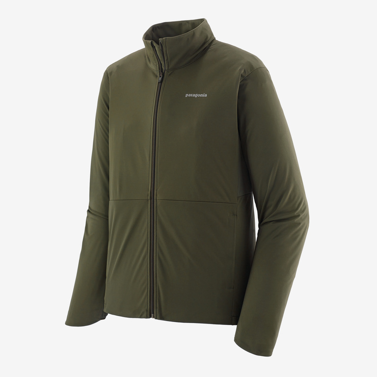 Stretchy soft-shell fabric wards off wind, and a DWR (durable water repellent) finish that's made without PFCs (perfluorinated chemicals) resists light precipitation; Capilene Cool Lightweight fabric bonded to the inside provides fast-drying comfort and a soft next-to-skin feel